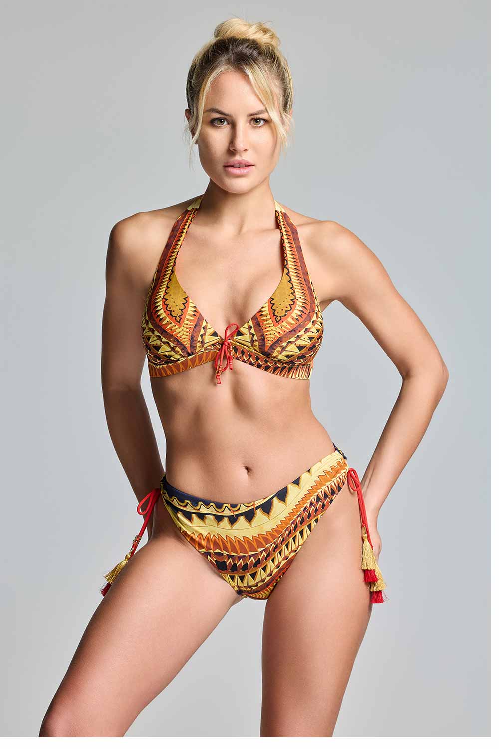 Deze mooie serie van het exclusieve badmode merk Vacanze Italiane is helemaal trendy in 2026! De Malindi Bay Nocciola Bikini Set bestaat uit een halter bikini top en een slip.