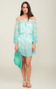De Lola Beach Dress Turquoise is een prachtige off-shoulder zomerjurk met een elastische Bardot halslijn en taille. Driekwartmouwen in een losse pasvorm geven deze jurk een ontspannen en gemakkelijke uitstraling.