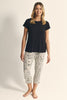 De Amande Pyjama Set 1 van Promise is een 2-delige pyjama set. De set bestaat uit een capri broek en een top met korte mouwen. De zwarte top heeft korte mouwen en heeft op de schouders een kanten stuk. De capri broek met elastische band is ecru met een katachtige print. Er zijn meerdere item's verkrijgbaar in de Amande serie. Door de combinatie van stoffen is deze pyjama heerlijk zacht.
