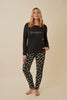 De Pyjama Party-Set Stip van Promise is een 2-delige pyjama set. De Pyjama Party-Set Stip bestaat uit een lange broek en een top met lange mouwen. De zwarte top heeft lange mouwen en een ronde hals. De top heeft een zilverkleurige tekst "Bonjour" aan de voorkant. De zwarte lange broek heeft een elastische band en steekzakken.
