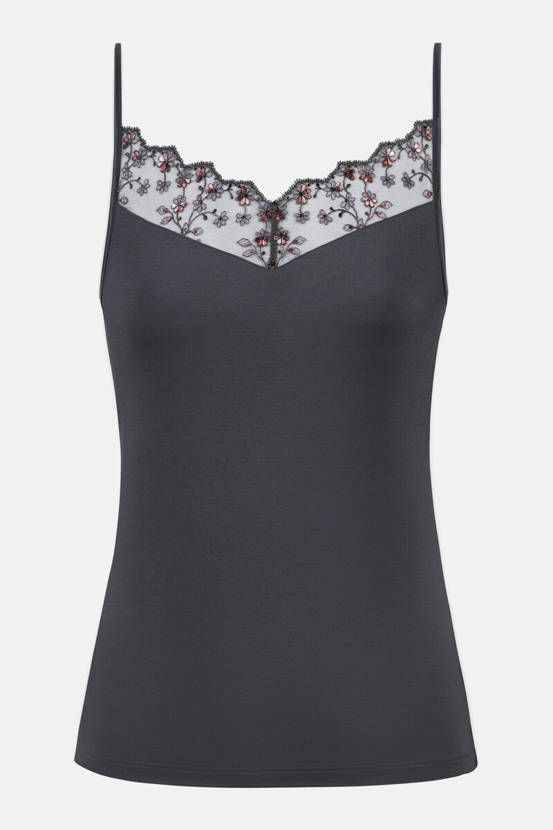 Delighted Spaghetti Top Thunder Grey van Mey heeft dankzij een bijzonder hoog aandeel modal een glad en elegant oppervlak met een zijdeachtige glans.